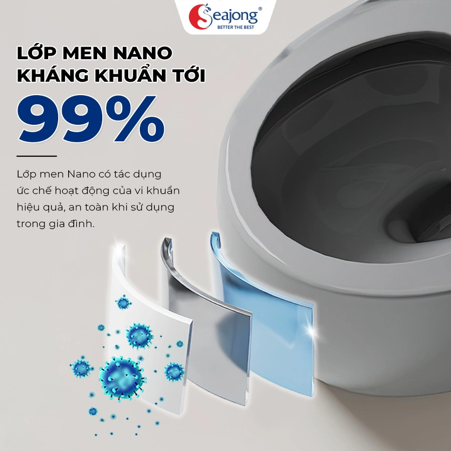 - Bề mặt phủ men Nano bạc kháng khuẩn giúp ngăn ngừa vi khuẩn phát triển, chống bám bẩn, ngăn vết giữ cho bồn cầu luôn sáng bóng, dễ vệ sinh và an toàn cho sức khỏe người dùng.