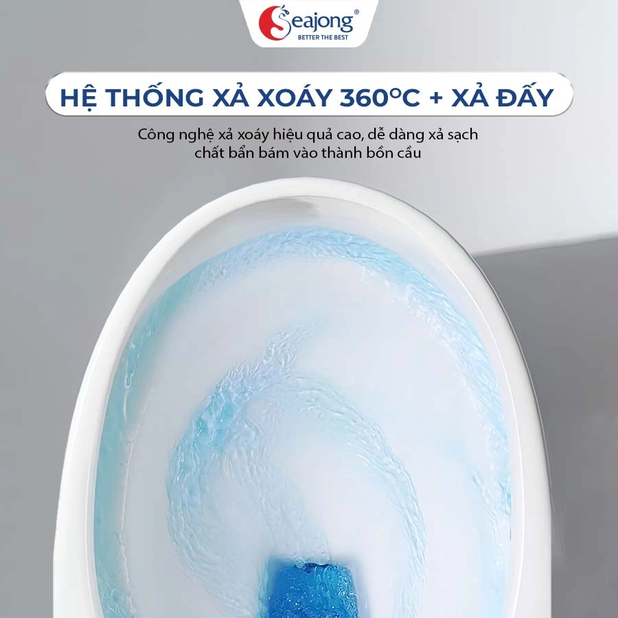 - Công nghệ xả 2 trong 1: Bồn cầu Seajong SJ-BC0141B sở hữu công nghệ xả Dual Flush 360° kết hợp với hệ thống xả đẩy sạch một lần, giúp tiết kiệm nước tối đa (xả tiểu 3L, xả đại 6L) và đảm bảo hiệu quả làm sạch mạnh mẽ.