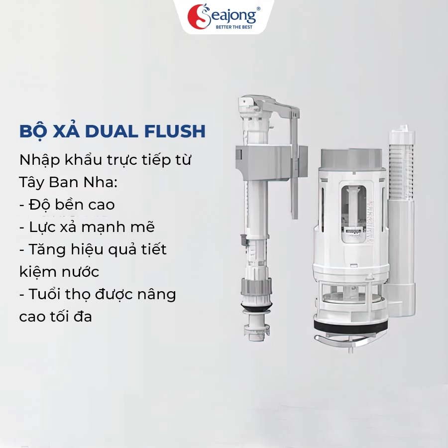 - Bộ xả dual flush của Tây Ban Nha: Bộ xả nhập khẩu từ Tây Ban Nha, có độ bền cao và khả năng xả mạnh mẽ, giúp tiết kiệm nước hiệu quả.